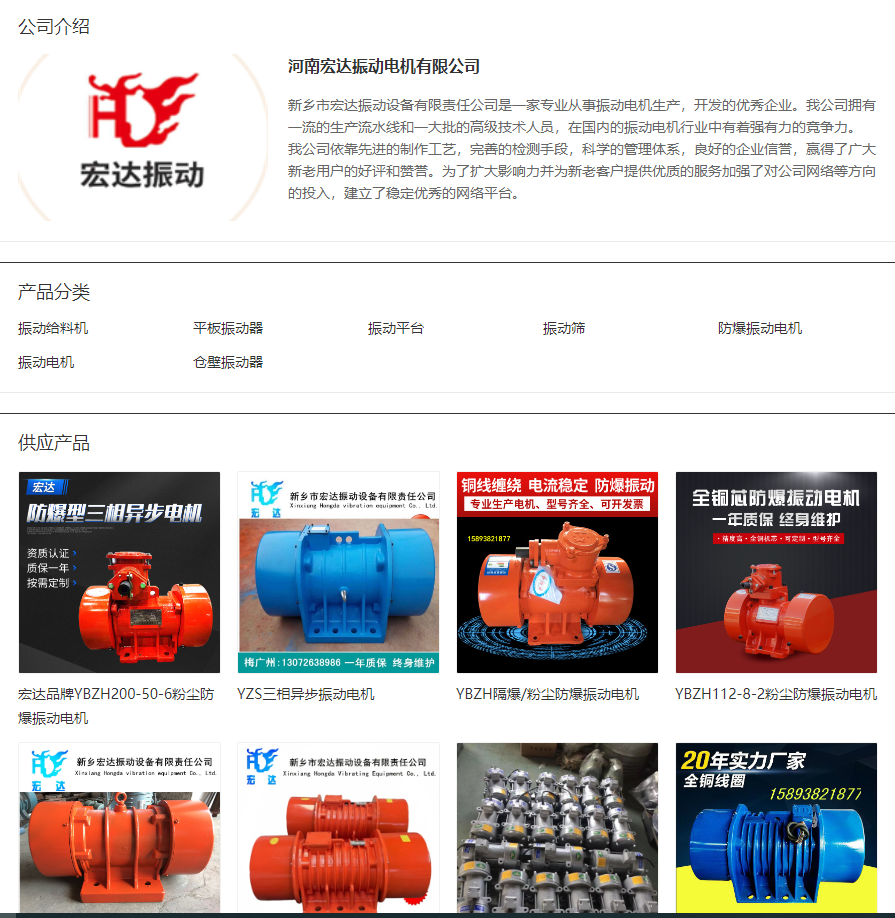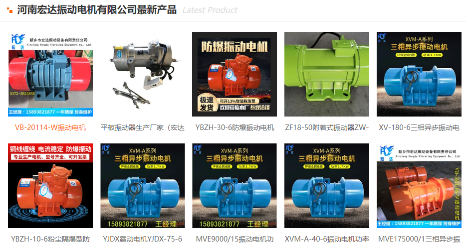 如果您對(duì)我們的產(chǎn)品感興趣或有任何疑問,請(qǐng)隨時(shí)聯(lián)系我們,我們將竭誠為您服務(wù)。電話:15893821877 0373-2632855。歡迎訪問我們的官網(wǎng),了解更多關(guān)于河南宏達(dá)振動(dòng)電機(jī)有限公司的信息和產(chǎn)品詳情?1